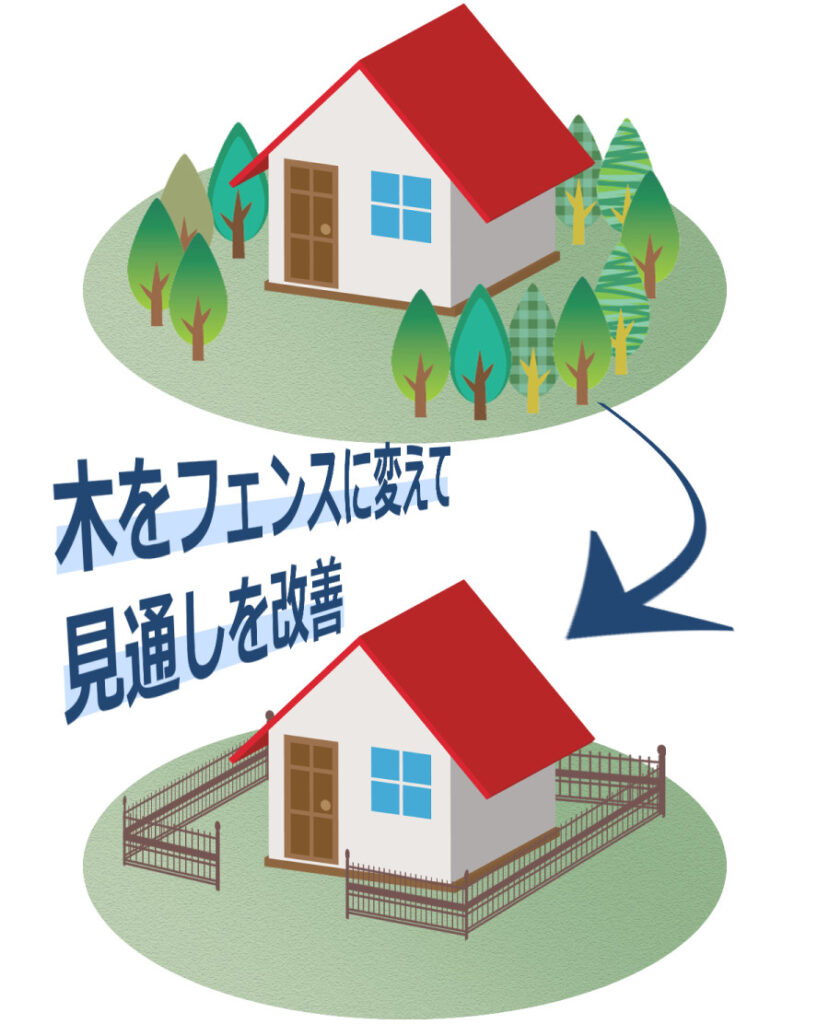 一番はじめにやった防犯対策は、建物をぐるっと覆っている何十本もの木を伐採し、網のフェンスに変えました。