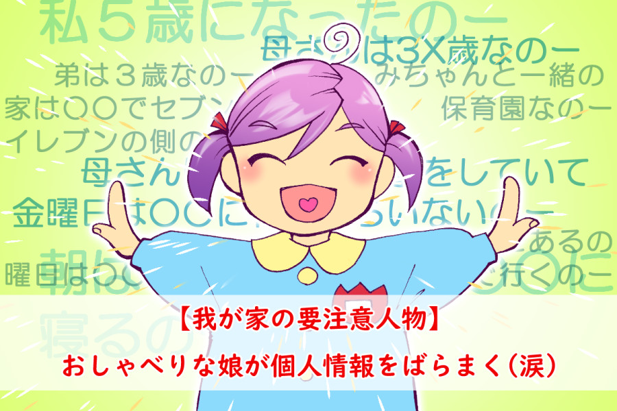 私「なんでじゃないでしょ!怖い人が来たらいやでしょ?自分からうちの情報を言わないの。相手が優しそうな人でも『わからないから、お母さんに聞いてください』って言ってね。あとお友達の家の事もぺらぺらしゃべっちゃだめだよ!!」