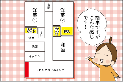 こちらはうちのマンションの間取りです。黄色の部分が収納スペースです。